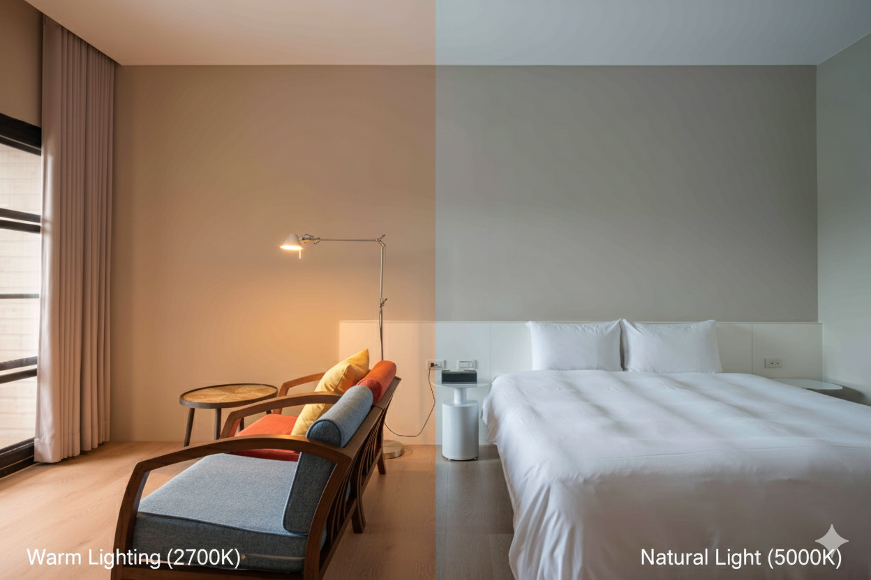 臥室: 主要照明建議 2700K - 3000K。床頭燈可調光調色溫更佳。
